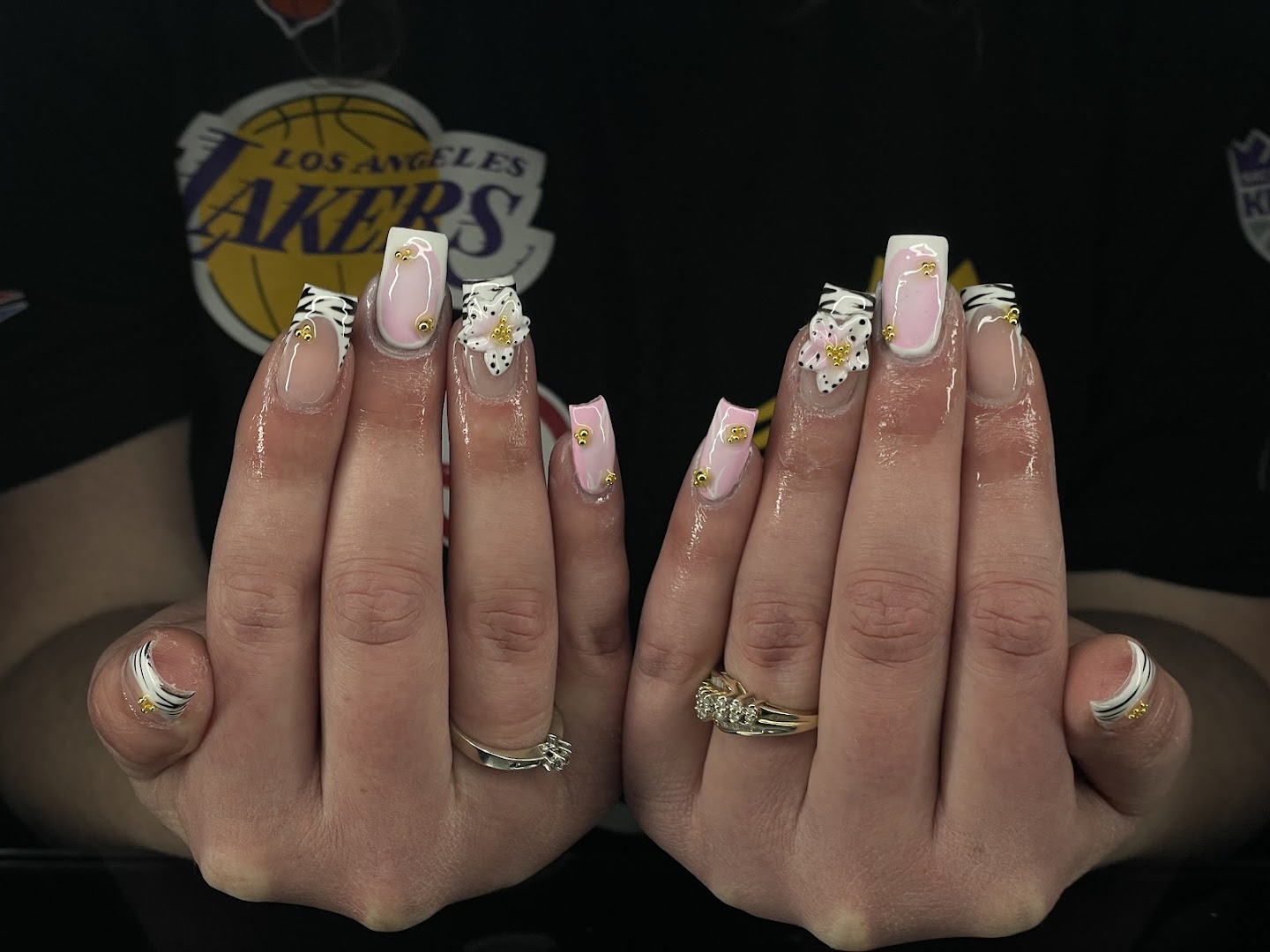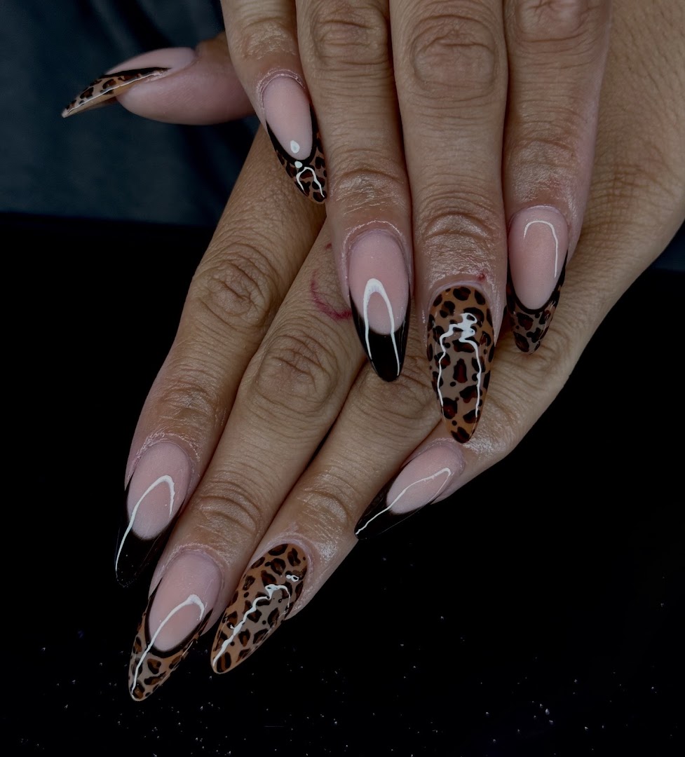 - Services include haircuts, shampooing, acrylic nails with detailed line work, and custom nail designs.