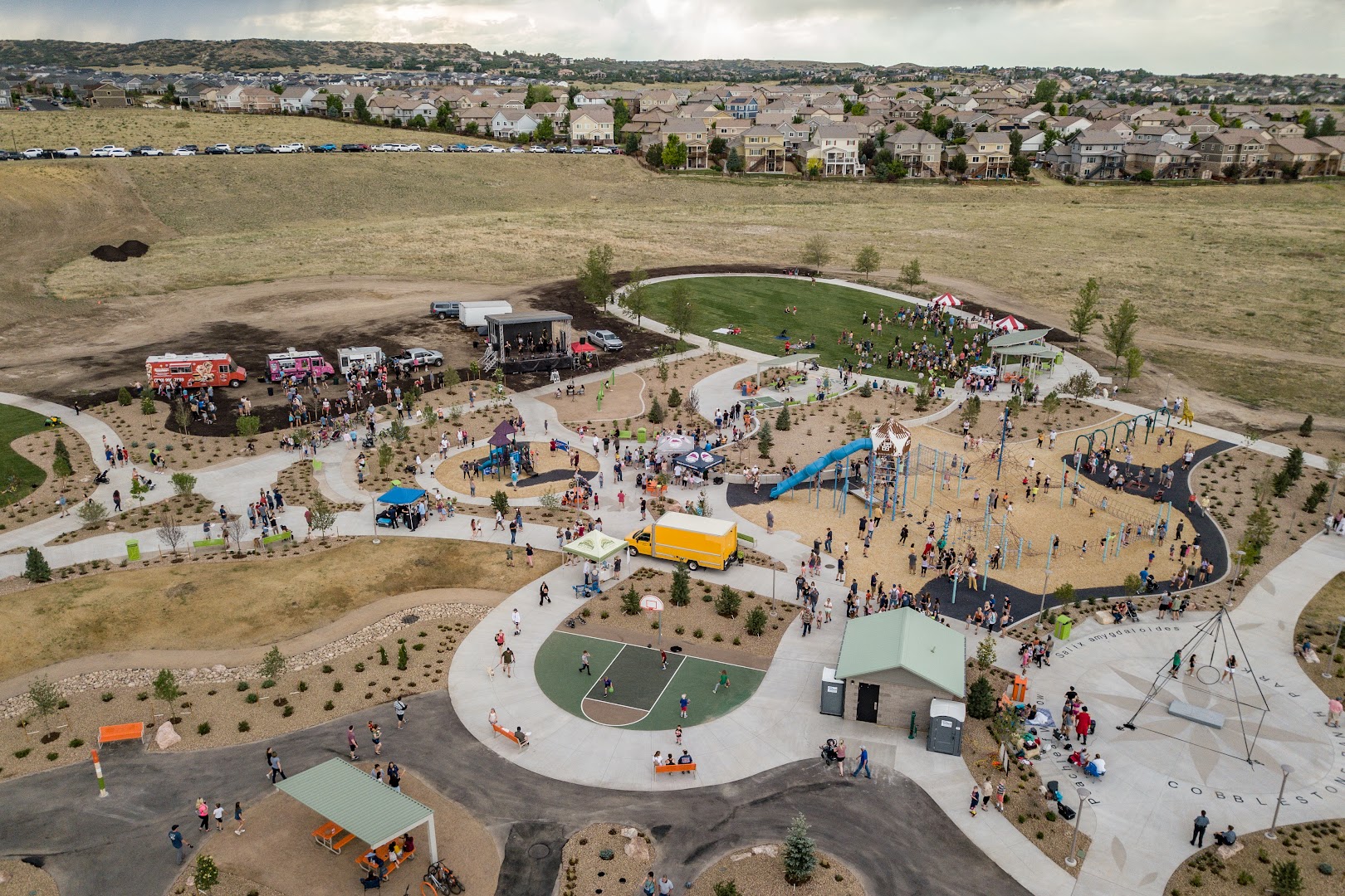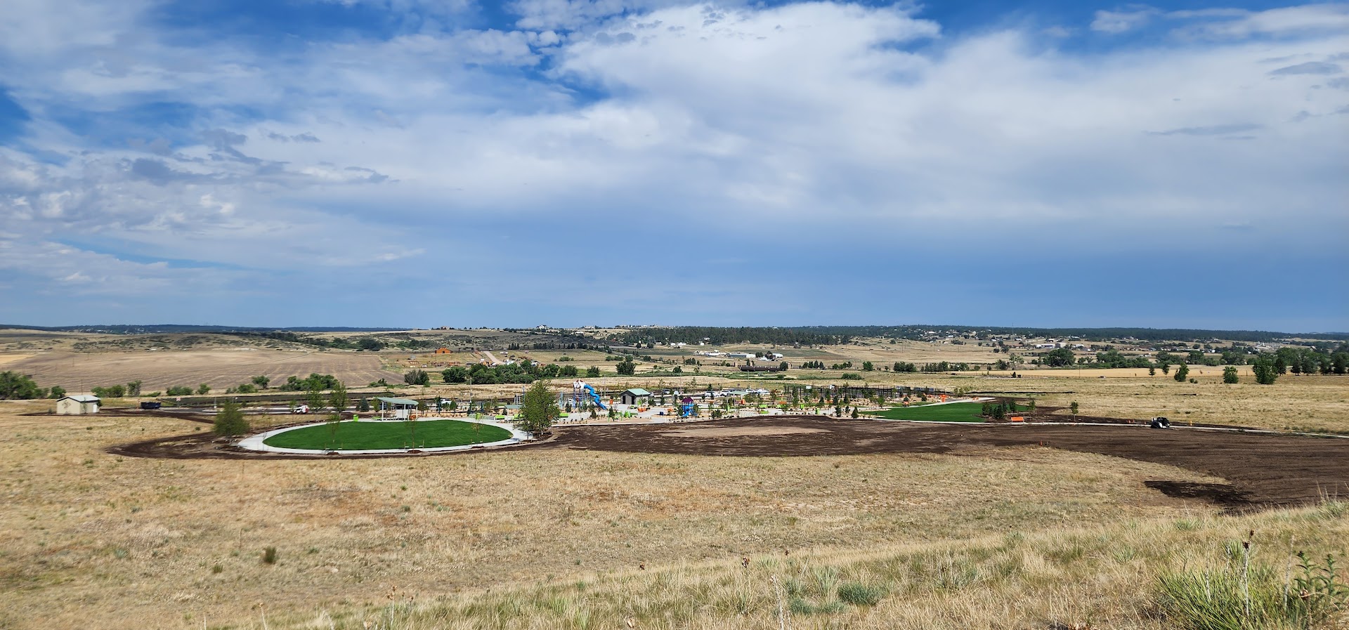 Cobblestone Ranch Park in Castle Rock offers a versatile outdoor space with playgrounds featuring rope climbing, slides, swings, and trampoline structures. Visitors can enjoy picnic tables with awnings, public restrooms, and a designated skateboarding area in a scenic neighborhood setting open daily.