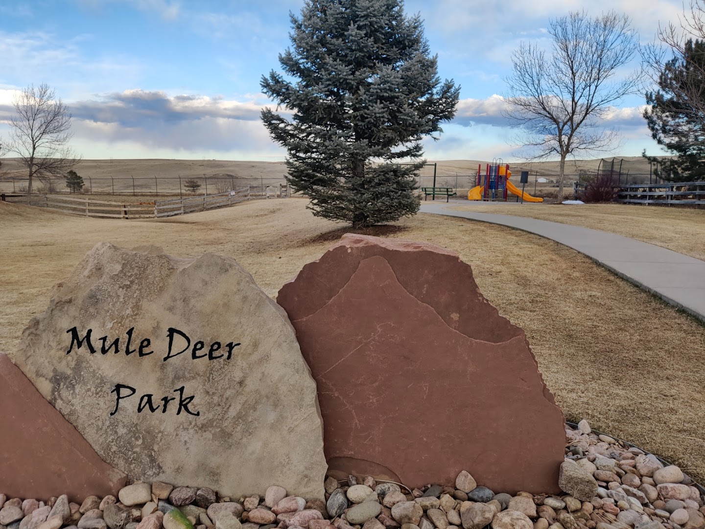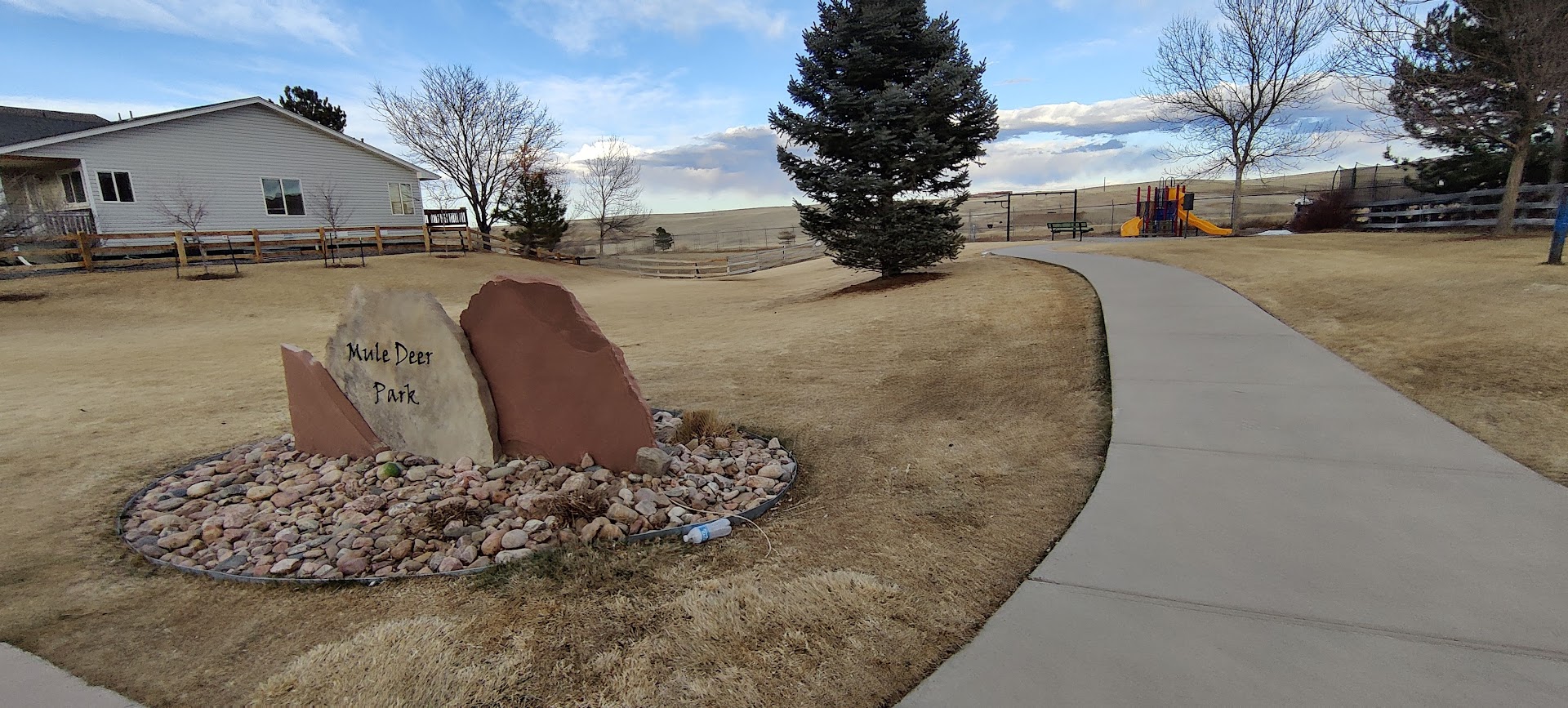 Mule Deer Park offers a well-maintained playground with swings, slides, and expansive grassy areas ideal for children and dog play. Equipped with a dog care station, it fosters cleanliness and community care.