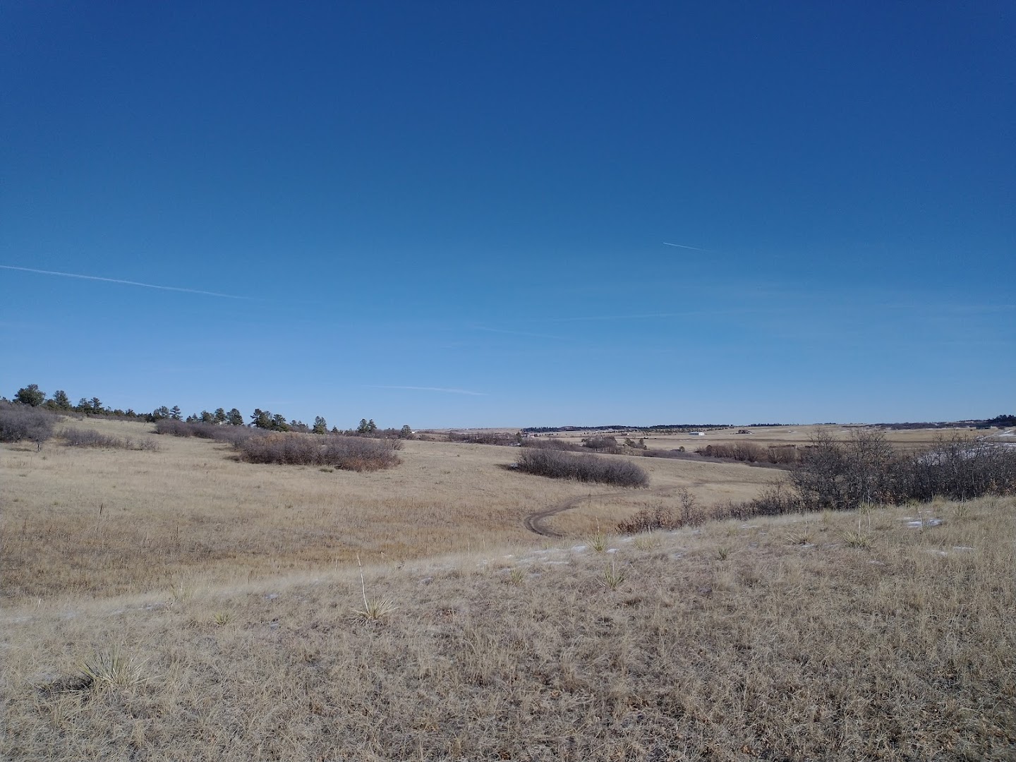 Palmer Ranch Divide Trail in Larkspur features about five miles of looped trails winding through prairie landscapes with occasional shade. Visitors enjoy hiking, spotting wildlife such as deer, and picnicking by the creek and cottonwoods, with a vantage offering views of Pikes Peak nearby.