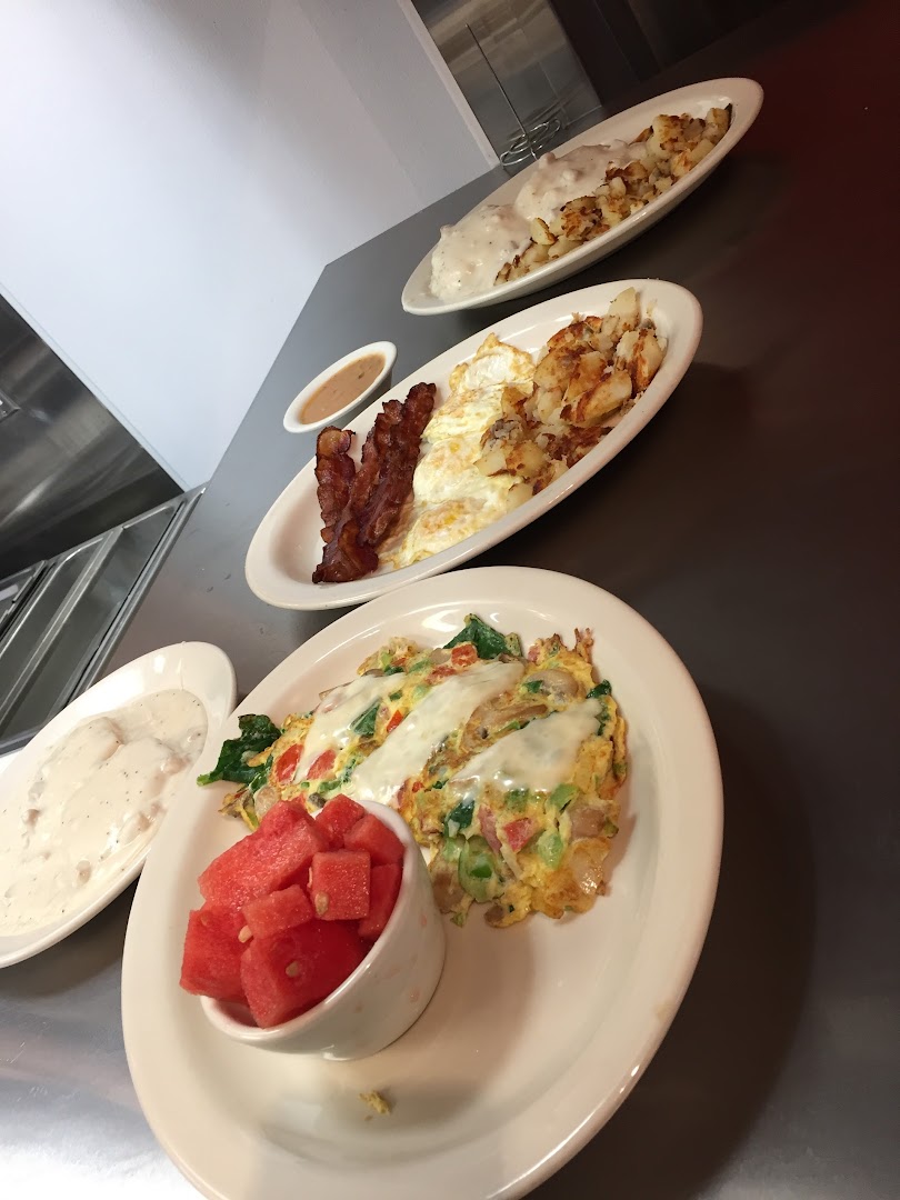 Biscuits and Gravy, Breakfast Burrito, Hash Browns, French Toast, Eggs Benedict, Chicken Fried Steak, Carnitas Skillet, Coffee, Pancakes, Omelets, NY Steak with Eggs