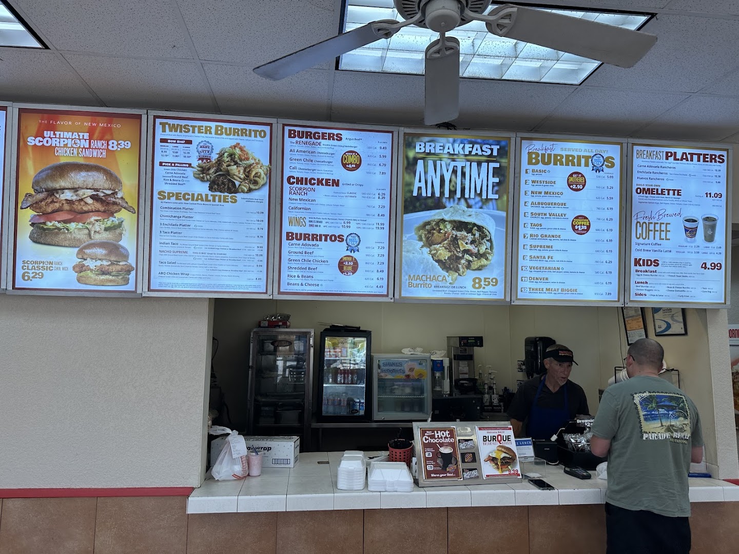 Breakfast Burritos, Green Chili Burgers, Chicken Chili Burritos, Breakfast Enchiladas, Omelets, Cheeseburgers, Twisters Curly Fries, Chili Dog, Sausage, Chile Cheese Fries, Salsa, Beans, Chimichanga, Guacamole Burger, Coffee, Vegetarian Options, Churros